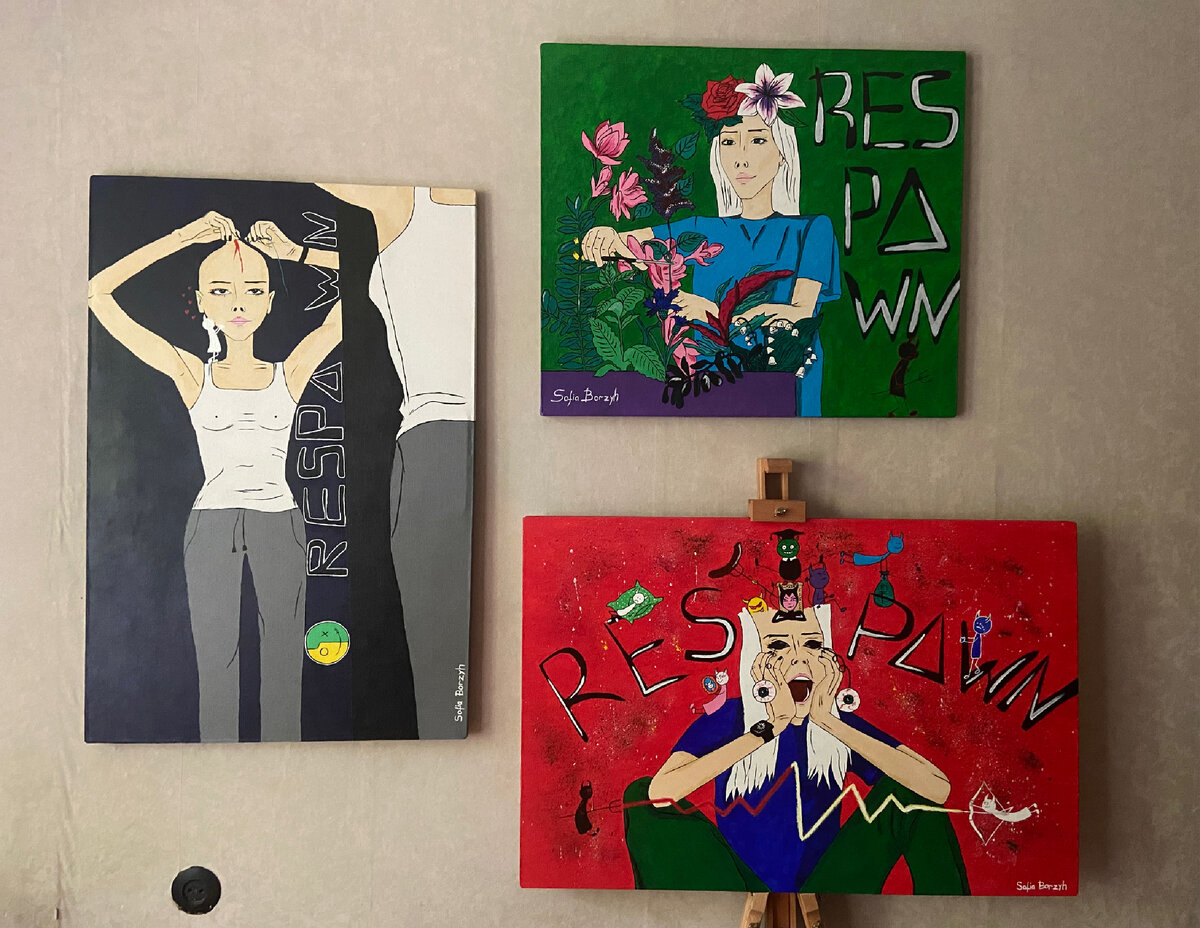 Всем привет. Меня зовут Софья Борзых. Почему Борзых? Борзая- наша любимая порода собак, это первое. Второе-я задолбалась страдать от своей скромности и стеснения. «Больше уверенности и всё будет», сказала мне моя коллега как-то на работе, поэтому без особых сомнений решила на себя взавалить ношу носить фамилию Борзых, чтобы не было шанса на сомнения. На фото вы видите мою серию картин, которая в идее была одна, а получилось целых три. Идея в голове морозилась год. Пока в один из дней я не решила, что пора взять кисти в руки и сделать это уже. Вы видите историю человека, которая знакома, наверное, каждому, когда ты физически перешёл в состояние взрослого и живешь как взрослый, но морально ребёнок. Ребёнком обрастать взрослыми домыслами, ценностями и их ожиданиями довольно трудно и ты вообще не понимаешь, чего от тебя хотят. В какой-то момент бошка взрывается и ты пересобираешься по-новому… Под каждой картинкой ниже, вы увидите краткий посыл каждой из них Я писала о тех людях, кто мн