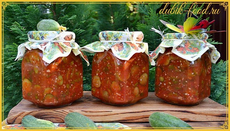Готовый салат в горячем виде разложить в стерилизованные над паром баночки и закатать.