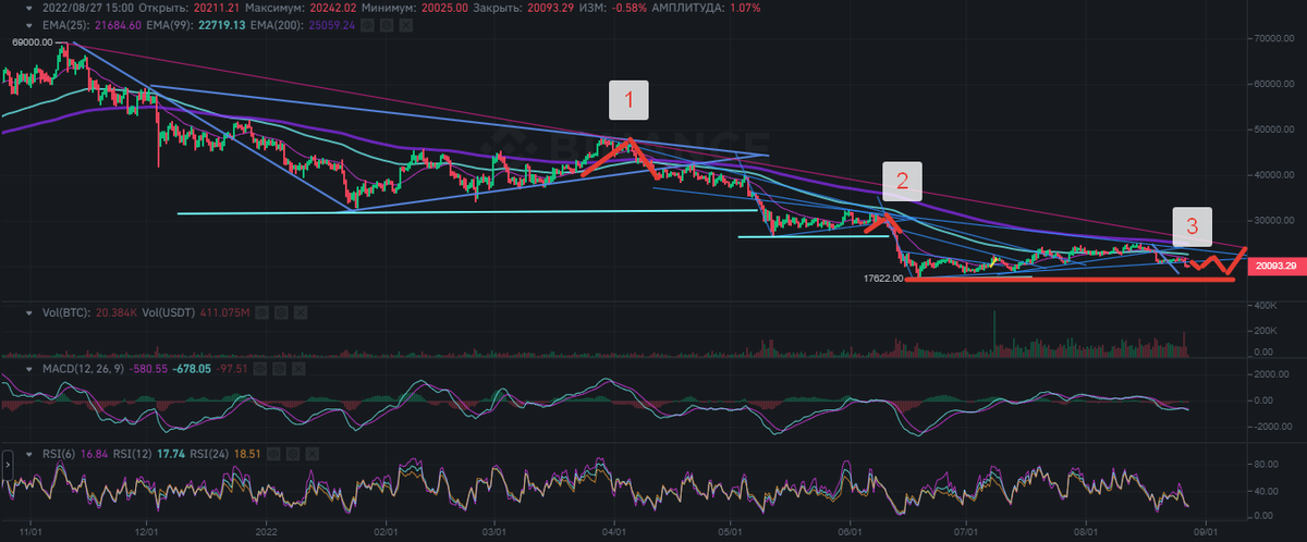 Даже не знаю с чего начать, всё такое вкусненькое подвезли. Курс BTC. Самое интересное, что сейчас происходит это падение курса. Я не буду писать про заседание ФРС и борьбу с инфляцией, об этом на своём канале написал мой коллега. Лишь напишу, то, что быстрый разворот тренда не получился, что и не удивительно. Если посмотреть на эту замечательную картинку, то мы увидим, что в курсе BTC всё время всё повторяется, просто слегка в разных масштабах. Пробиваем восходящий канал вниз, затем пытаемся удержаться на линии поддержки и если не удержались скатываемся на следующий "этап". В текущем случае у нас линией поддержки выступает 20000$, это вообще знаковый уровень и второй уровень, после которого я вижу только down trend, это 17500$. На рисунке он обозначен жирной красной линией. Кстати сегодня так же прошёл слух, что 140.000 BTC Mt.Gox, которыми управляет Кобаяси были выброшены на биржи. Слух это или правда, покажет время, но сейчас мы должны подтвердить дно битка на уровне около 19-20К, п