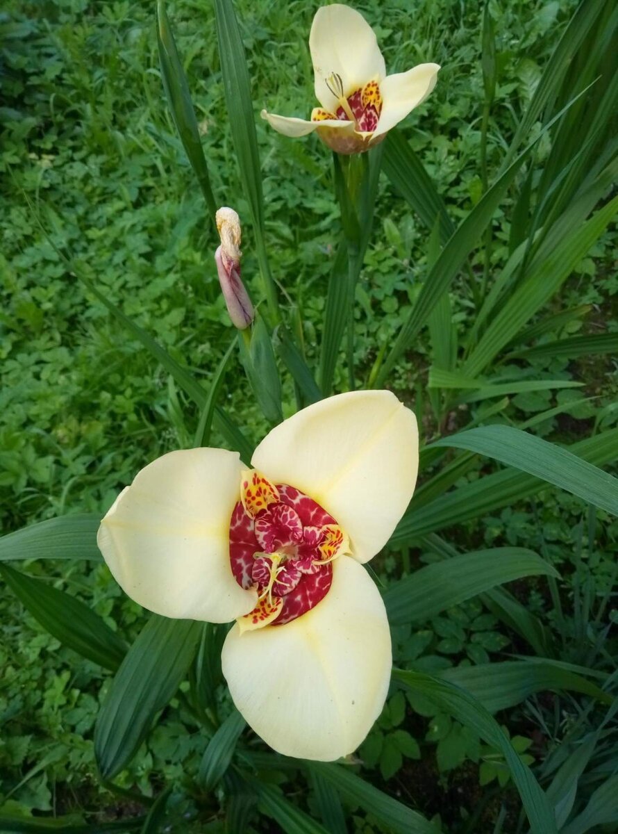 В первый год своих посадок, а было это 4 сезона назад, купила луковички со странным названием Тигридия. Посадила. Выросли. Мы тогда не жили еще на даче, только приезжали. И вот я видела что бутон появился, потом приезжаем - отцветший пожухлый цветок. Почитала еще про это растение. Оказалось, что цветок Тигридии живет всего сутки. Даже меньше. Несколько часов. И я никак не попадала на ее цветение. Потом мы отремонтировали комнату в старом доме, и смогли оставаться с ночевкой изредка. И я увидела, как она цветет. Я всех звала, чтобы посмотрели. Это ведь редкость!!!