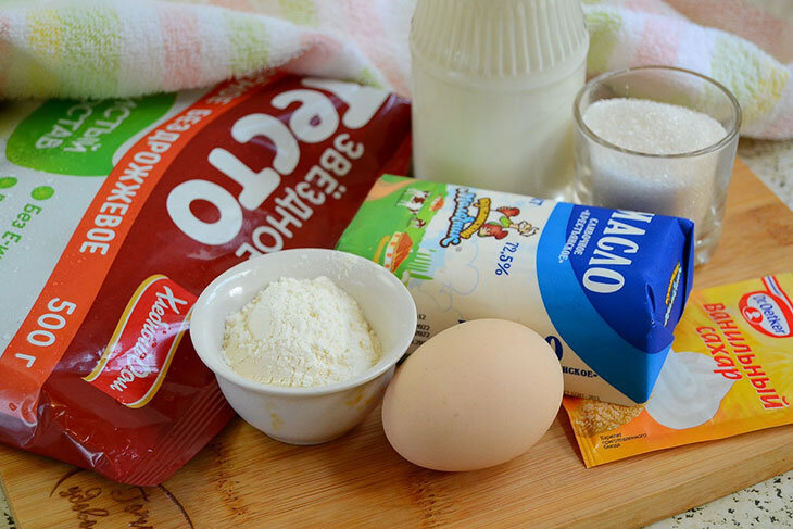 Возьмем продукты по списку, чтобы приготовить десерт «Наполеон» в стакане. Слоеное тесто предварительно нужно достать из морозилки и подержать при комнатной температуре 15-20 минут. Для приготовления 3-4 стаканов десерта объемом 250-300мл достаточно одного пласта весом 200-250 г, поэтому учитывайте это при расчете нужного количества порций. Ингредиенты: Как приготовить: 1. Для заварного крема в миске смешиваем яйцо, сахар, ванильный сахар, кукурузный крахмал и пару столовых ложек теплого молока. 2. Все хорошенько взбиваем вилкой или венчиком, чтобы крахмал разошелся и масса стала однородной. 3. Оставшееся молоко и яично-сахарную массу выливаем в сотейник и ставим на плиту. На среднем нагреве при постоянном перемешивании доводим крем до закипания. 4. Добавляем сливочное масло, размешиваем крем до однородности, снимаем с плиты и охлаждаем при комнатной температуре под крышкой. 5. Перекладываем крем в подходящую по объему миску и убираем в холодильник. 6. Лист слоеного теста немного раска