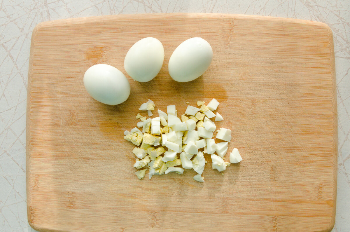 Яйца отвариваем, очищаем и нарезаем небольшими кубиками. Примерно такими же кубиками нарезаем огурец. Чеснок пропускаем через пресс.