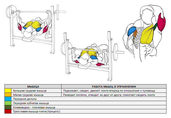 Жим лежа - это базовое упражнение, позволяющее прокачать практически весь верх тела атлета. Как и любое базовое упражнение, жим лежа включает в работу большой массив мышц, что ведет к росту силы и массы спортсмена. Итак, мышцы, которые работают в жиме лежа следующие:
