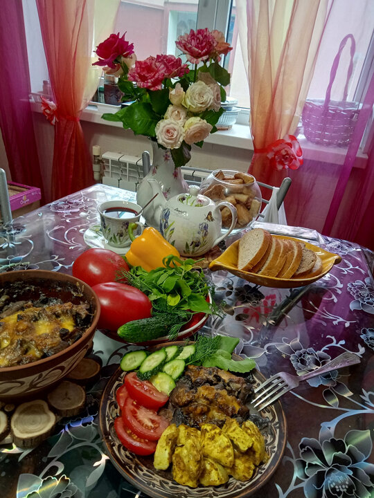 Воскресный обед с семьей. Щи летние: Бульон на свиных ребрышках молодой свинки. Овощи (молодой картофель 2 шт., много свежей молодой капусты, болгарский перец, морковка, свежие помидоры и петрушка с укропом) закладываются по очереди без пережарки. Варила 20 минут. + 2 фото Свежие шампиньоны в соусе из ряженки, запечённые в духовке. Шампиньоны режем, выпариваем в сотейнике всю влагу, добавляем лук и заливаем ряженкой, смешанной с одним яйцом и черным перчиком. Выкладываем в форму и запекаем 15 минут. Сверху - тертый сыр. Очень вкусно! И летний вариант быстро приготовленных кабачков: Режем их кубиком, добавляем две ложки сметаны или йогурта, пряные травы, два зубчика чеснока, две ложки псиллиума. Перемешиваем и укладываем ровным слоем в форму. Запекаем 30 минут при 170 градусах. Прекрасно держат форму, и очень вкусно! Овощей и зелени всегда много к любому блюду. Без них уже не могу - салаты приелись. Просто режем и грызем. Обед всем понравился! Больше общения и рецептов - в группе "Рецеп