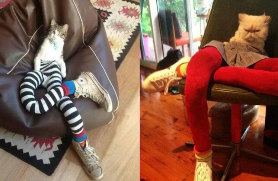 Весьма странно видеть кошек в колготках и носках, но интернет не перестает нас удивлять