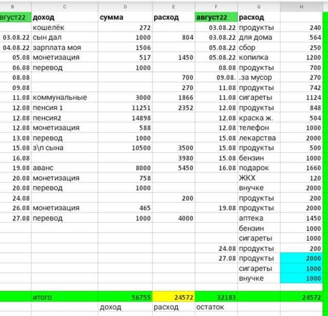 Доброе утро, мои дорогие подписчики и просто читатели канала. Вот и начинается новая рабочая неделя. Как же хорошо, когда есть и работа и здоровье. Правда плохо, что не знаю как добираться до работы. Автобус школьный пока не ходит. Придётся вызывать такси. Как я не люблю ездить на такси! Есть и второй вариант. Можно написать заявление директору и попросить 2 выходных. Но вроде жалко терять дни, но и жалко тратить деньги на такси😃 И пешком я уже не дойду. Ладно, будем думать. Итоги бюджета за 28 августа Дохода вчера не было. Но и расхода вчера тоже не было. Был мой любимый зелёный день. Так что ничего в таблице не изменилось. И опять искала вчера документы, но не нашла. Звонила вчера и мастеру. Но как и думала, у него нет наших инструкций. И что делать не знает. Сказал, что надо ехать в газовый участок и там уже решать этот вопрос. Так и сделаем. Но зато договорились с ним на этой неделе поехать за материалами для отопления. Так что, деньги пока есть свои, надеюсь, что х