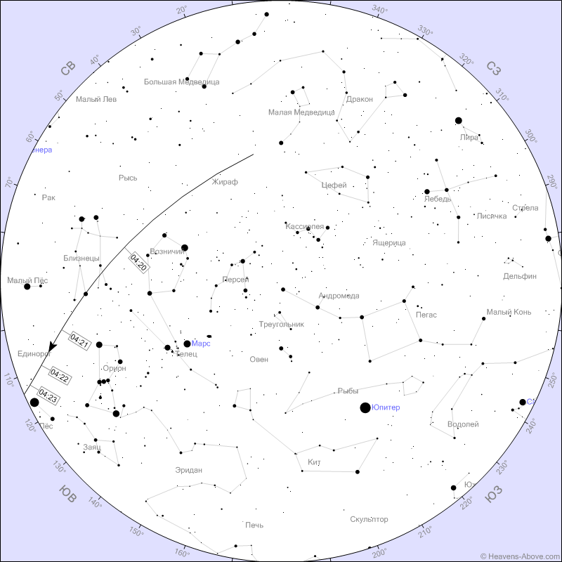 были запущены очередная серия из 54 спутников Starlink. Наклонение орбиты данной группы спутников почти в точности совпадает с предыдущей серией, а, значит, мы вновь можем любоваться "Небесным Паровозиком" Илона Маска в небе над Крымом. Первый пролет будет над нами нынешней ночью, 29 августа, с 4:19 по мск. Спутники появятся высоко над горизонтом - выйдут из Земной Тени и начнут свое движение к горизонту. Яркость в момент появления - около 3 звездной. Интересно посмотреть именно нынешний пролет - когда спутники еще находятся очень близко друг к другу! Карту пролета прилагаю (Сгенерирована в приложении heavens-above) Для ориентации - "Паровозик" появится чуть южнее Полярной Звезды, и будет двигаться по направлению к ЮВ. Но это еще не все яркие события нынешней Ночи. Если Вы проснетесь чуть ран