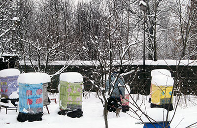 Все ульи поставили на подставки высотой 30–50 см, которые обмотали пергамином, чтобы не занесло снегом.