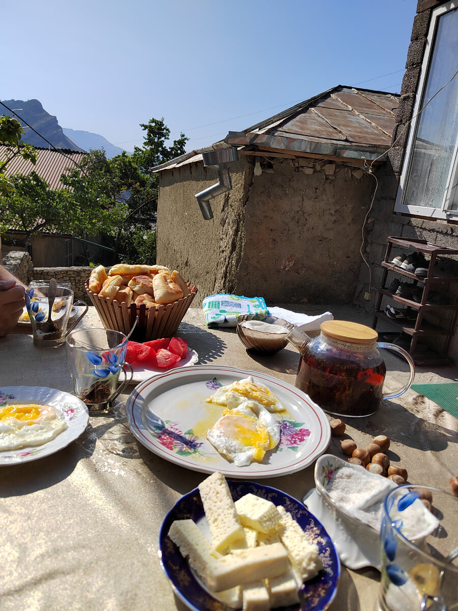 Вчера, как я уже писала, мы познакомились с Мариной и Денисом. Ребята оказались очень хорошими, мы разговорились и болтали до самого вечера. Они путешествуют по Дагестану на машине, которую арендовали в Махачкале. На сегодня у них был запланирован маршрут в Гоор и Карадахскую теснину, и по итогу они взяли меня с собой 💔. Завтракали мы снова дома у соседки Асии, и если есть возможность, постарайтесь поесть в гостях у местных, не постесняйтесь и попроситесь к ним на завтрак, обед или ужин (за деньги, разумеется), потому что с такой душевностью вы не поедите нигде. На завтрак нам приготовили яичницу, кураговую кашу с урбечом, ничем не уступающую каше в Hinkal Brothers, вкуснейшие дагестанские пышки, рука к которым тянулась, даже когда дышать от переедания было тяжело, травяной чай, сыр, помидоры и смородиновое варенье. Дальше мы поехали в Карадахскую теснину. От Гуниба до нее 35 км, но что касается трансфера из села, то маршруток нет. Можно доехать либо на такси, но это очень дорого, вас