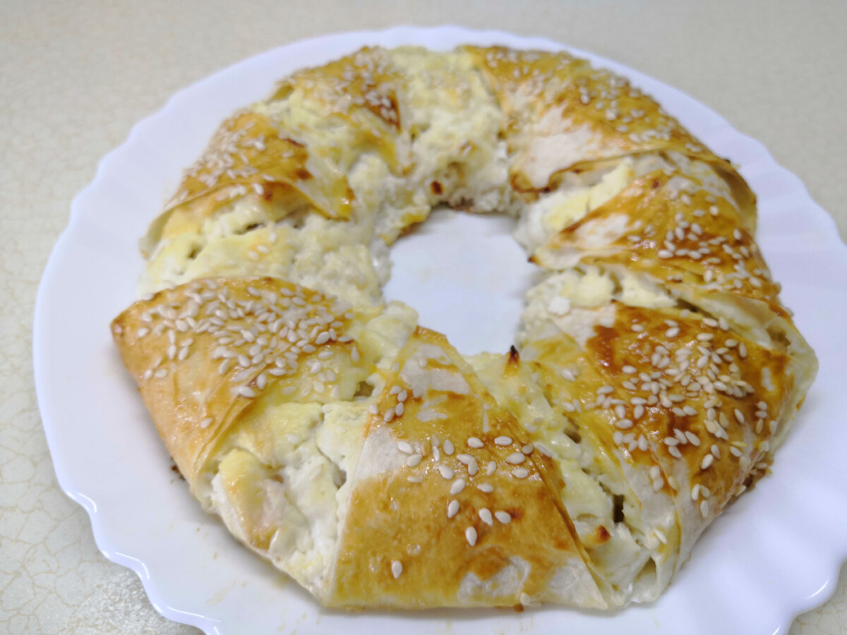 Ингредиенты: Шаг 1. Лаваш лучше взять тонкий, чтобы хорошо лег на творог. Вырезаем два круга, у меня тарелка диаметром 24 сантиметра. Затем оба круга разрезаем на 8 равных треугольников. Шаг 2 Одно яйцо разделить на белок и желток. К белку добавить творог, подсластитель, немного ванилина, сухофрукты ( я добавила свежее яблоко, но оно в процессе запекания выделяло сок, жидкость также выделяется еще и из творога, я убирала из середины кольца, когда жидкости стало много - бумажной салфеткой, чтобы не потерялась форма) Шаг 3 На бумагу для выпечки выложить треугольники по две штучки из лаваша по кругу, внутренний круг у меня получился диаметром примерно 7 см. Сделать круг из творожной массы. Затем накрываем творог одним слоем лавашных треугольников, смазываем желтком, накрываем вторым слоем лаваша и снова желток. Посыпать кунжутом Шаг 4 Переложить кольцо вместе с бумагой в форму и запекать в духовке при 180 градусах 25-35 минут