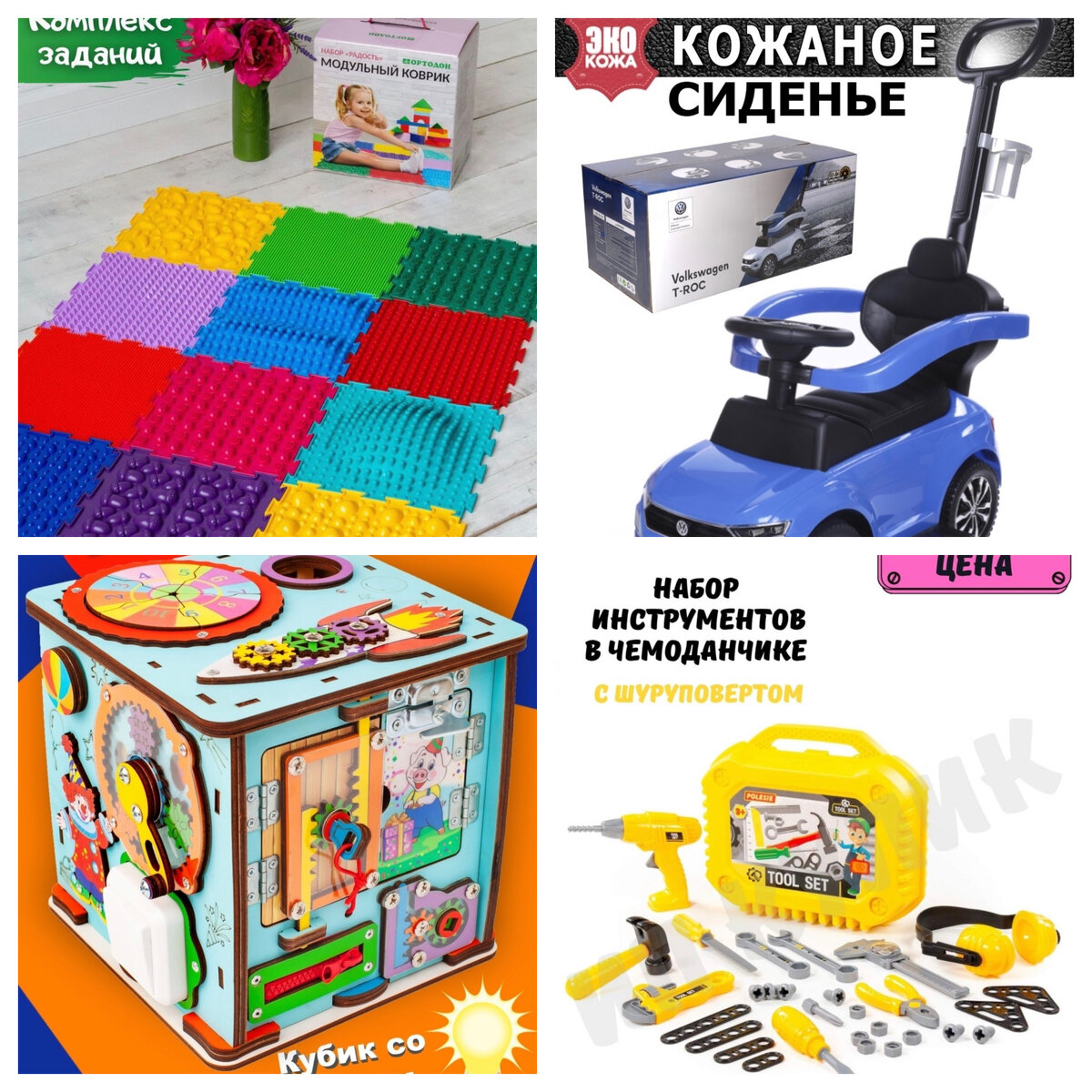 Малыш в 1 год уже умеет ходить и ему важно не находиться в замкнутом пространстве. Ребёнку нужно вести поисковую деятельность, все трогать, пробовать, исследовать. Дети очень любят игрушки каталки с длинной ручкой, толокар. Также им очень интересны бытовые предметы. Поэтому родители приобретают бизиборды, где много выключателей, безопасных проводов, гаек, ключей и тд. С 1 года ребёнку уже можно приобрести ортопедические коврики, чтобы развивать координацию, моторику, и дополнительно проводить массаж ножек, развивать тактильные ощущения. Сортируйте пуговицы, шишки, камушки, прячьте в коробки с сыпучими предметами фигурки животных и удивляетесь вместе с ребёнком, когда он их находит. Все под присмотром мамы, чтобы ребёнок не проглотил предмет. Играйте в сюжетные игры, где животные или куклы кушают ложками, пьют из чашки, одеваются, это разовьёт в малыше навык самообслуживания. Учите части тела на игрушках (смотри какие ушки у зайца, а где у зайки хвост). Также к сюжетным играм подходя