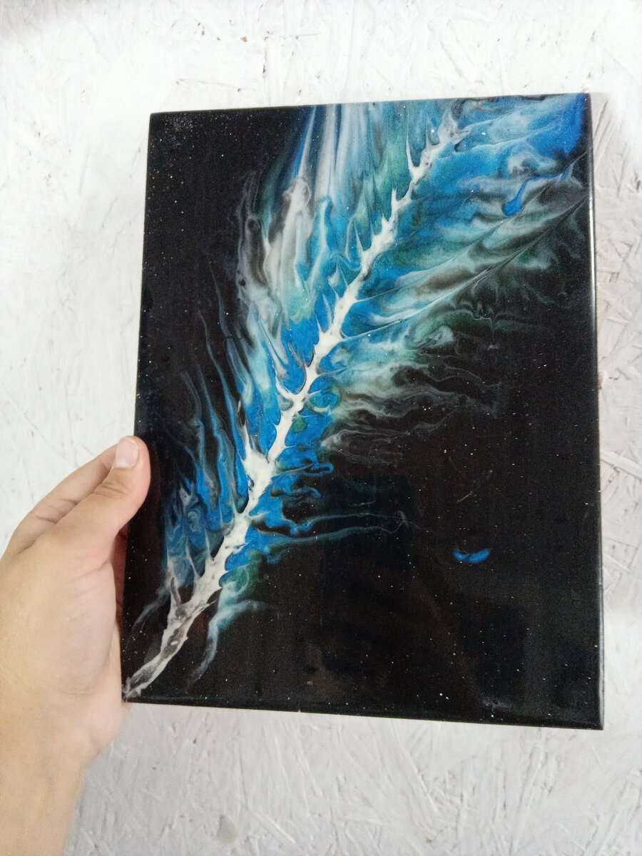 Короче! Есть у меня вот такая фанерка с перышком которое я рисовала эпоксидной смолой. Конечно я хотела повесить это перышко как картину на стену , но передумала! Вообще подглядела я , как другие рукодельницы делают шкатулки из картона и мне тоже захотелось! Нашла подходящую коробочку приклеила на все стороны картон в два слоя и чтобы картон в глаза не бросался заклеила коробочку полность тонкими салфетками. В работе использовала клей пистолет и ПВА. Кстати на фанеру с изнаночной стороны приклеила картон склеенный в три слоя, который по размеру совпадает с внутренним периметром коробки. Когда шкатулочка немного подсохла покрасила её тёмной краской. Результат выложу только завтра, когда всё окончательно высохнет.