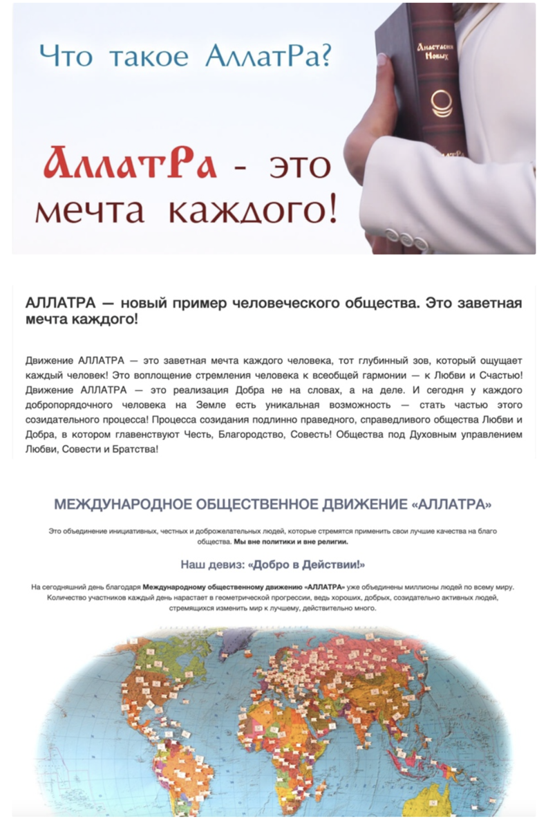 Впервые с упоминанием об «АллатРа» я столкнулась в сентябре 2018 года. Тогда вышла вторая моя статья из серии «Зазеркалье». В комментариях к ней начали проявляться последователи этого движения, настойчиво предлагали почитать их книгу. Мне это напомнило лихие 90-е и их свидетелей Иеговы. Но я для эрудиции всё же поискала информацию об этой организации. О себе на своем сайте они пишут: