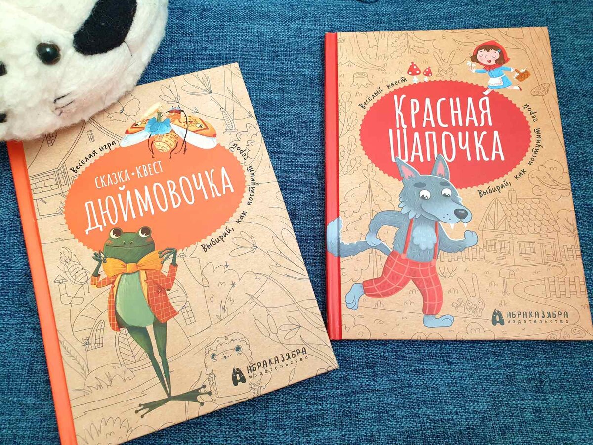 Книги-квесты были и в моем детстве, но обычно для читателей постарше. А сейчас я нашла классические сказки в таком формате. Наверное, все к школе их знают. И тем интереснее в знакомой истории найти разные варианты. Ведь именно от читателя зависит как пойдет сюжет. Красная шапочка всем известна, но здесь можно выбрать разные варианты ее пути. Например, она может не заговорить с волком. И тогда история кончится быстро, но очень хорошо. Или девочка подружится с волком и они вместе испекут пирожки. После известного начала и хода событий можно выбирать дальнейшее развитие. Предложены альтернативные варианты и тогда нужно перейти на страницу, которая продолжит выбранную линию. В этой же серии книг от Абраказябра у нас есть вторая книга про Дюймовочку. Смысл такой же. Выбираем ее судьбу на свой вкус. Так же есть выбор страниц и от решения зависит будут у крошки приключения или все сложится без них, но быстро и счастливо. Для нас это не просто интересный формат, это возможность поговорить о
