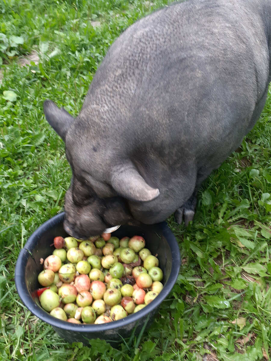 В жизни есть место драматургии, значит есть сцена и на ней мизансцена. Так на сцену выбежала вьетнамская чёрная вислобрюхая свинья и сразу же организовалась мизансцена, где на авансцене, т. е. на переднем плане, оказалась она. Вбегая, она держалась края дорожки, двигалась немного бочком, как будто стеснялась. Мы сидели на улице около костра и ждали, когда же поджарятся купаты. Две огромные собаки лежали около дома со стороны фасада, а разноглазая хаски в ожидании еды заняла стратегически верную позицию, залезла под стол, где она едва помещалась. Хозяин, увидев свинью заорал на неё: "Тварь, гадина непослушная, где шлялась? Зачем ты вообще нужна?" Свинья, понимая, что её ругают, развернулась и собралась бежать назад. Странно, как она вообще сюда попала, ворота были закрыты, но на то она и свинья, видно вырыла себе лаз под забором. Хозяйка бросила ей вслед красное яблоко из привезённых гостями. И как только свинья 🐖 его схватила зубами, все дружно закричали: "Зачем, есть же зелёные".
