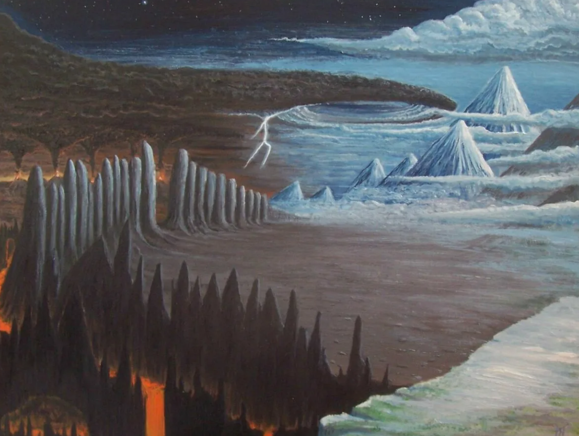 В начале времен не было в мире ни песка, ни моря, ни земли, ни травы, неба, звезд и солнца тоже не существовало. Лишь зияла бездна.... С одного края бездны — Страна света и огня, с другого — Страна тьмы и холода. И вот в Стране холода и тьмы забил источник: бурлит его вода, как в котле; берут там начало холодные, стремительные, ревущие реки с ядовитой водой. Чем дальше, тем медленнее текут они, а потом застывают, словно смола, и превращаются в лед. Росой сверху проступает яд и от холода тут же превращается в иней. Мировая бездна на севере заполнилась тяжестью льда и инея; южнее царили дожди и ветры, а в Стране огня и света было тихо, безветренно и тепло. Все ближе придвигались льды к Стране огня и света. Встретились иней и теплый воздух; стал иней таять и стекать вниз, как капли с сосульки. Ожили брызги и приняли образ великана (етуна). Это был Имир, древнейшее существо в мире. Разморило Имира от тепла, прилег он отдохнуть. Заснув, Имир вспотел,под левой рукой, где было горячо и влаж