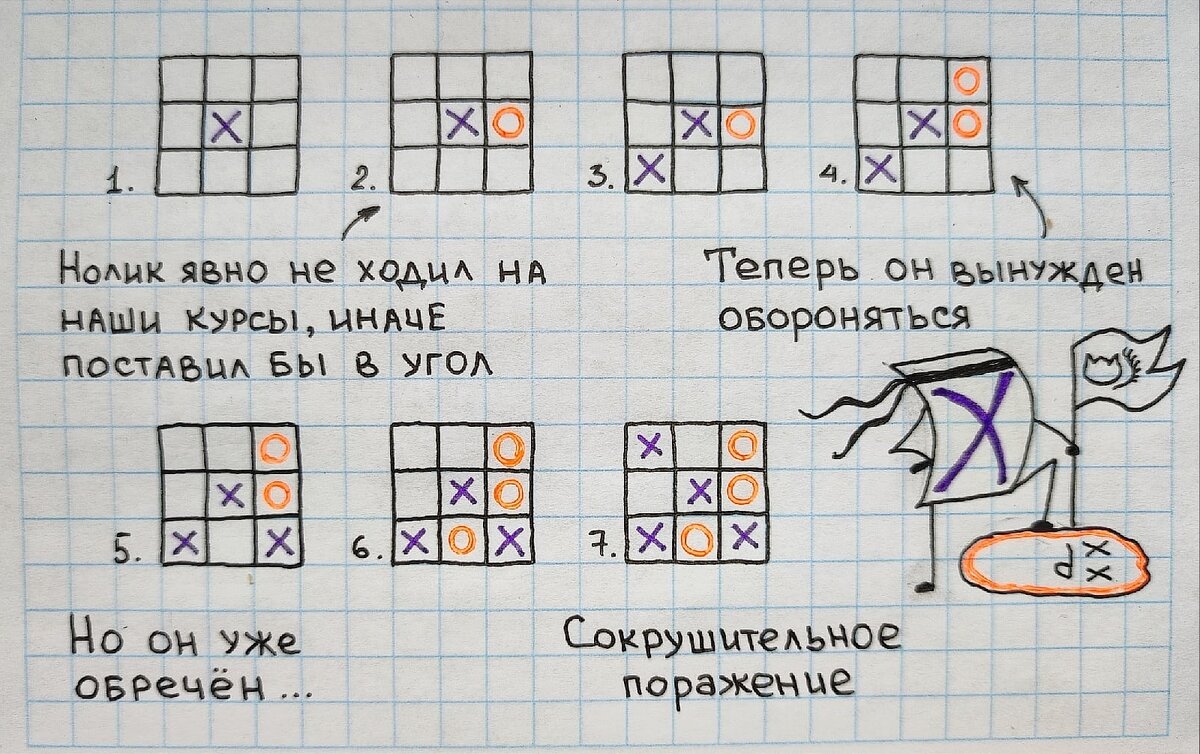 Вы вечно проигрываете в крестики-нолики? Устали от бесконечных издевок окружающих? Чувствуете себя неполноценным членом общества? Тогда вы обратились по адресу! Сегодня у вас есть уникальная возможность пройти наш обучающий курс по беспроигрышной стратегии, который стартует уже сегодня!