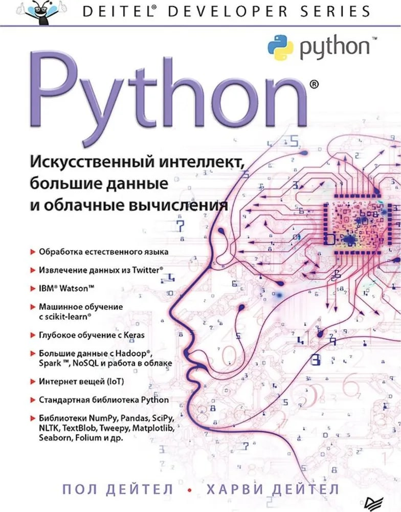 Python: Искусственный интеллект, большие данные и облачные вычисления Автор: Дейтел Пол, Дейтел Харви, 2020 Описание: Вы познакомитесь с обработкой естественного языка, анализом эмоций в Twitter, когнитивными вычислениями IBM Watson, машинным обучением с учителем в задачах классификации и регрессии, машинным обучением без учителя в задачах кластеризации, распознавания образов с глубоким обучением и сверточными нейронными сетями, рекуррентными нейронными сетями, большими данными с Hadoop, Spark и NoSQL, IoT и многим другим. #python #программирование #книга #учебник #питон