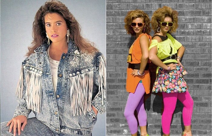 Самыми востребованными были изделия ярких кислотных оттенков: салатные, розовые, желтые. Лосины и разноцветные колготки были в гардеробе практически у каждой девушки. В холодное время года на женских ножках красовались теплые колготки в моднейшую полосочку. Капроновые варианты с узором также сметались с прилавков почти мгновенно.
