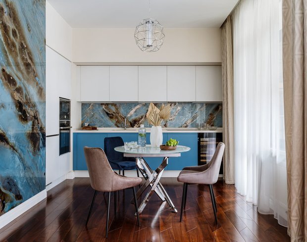 Заказчик хотел, чтобы квартира была наполнена настроением отпуска на морском берегу. Добиться эффекта дизайнеру Дмитрию Кондакову помог нейтральный фон, морские нотки и оригинальная арт-панель. Синий оттенок сделал пространство глубоким и спокойным, песочные стены стали хорошим фоном, а мебель и пол в коричнево-красных тонах — оригинальный акцент на многообразии фактур и натуральности. Каждую деталь продумали до мелочей: в интерьер отлично встроилась даже посуда — отдали предпочтение стеклу и имитации деревянных поверхностей.