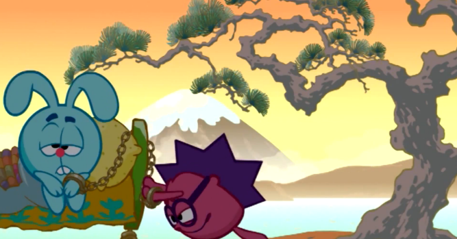 В этой серии, Крош занимается восточными единоборствами, которые конечно же практикуются на территории Японии. К тому же, в эпизоде также есть дерево похожее на сакуру, а на заднем плане, мы видим гору, очень напоминающую Фудзияму.