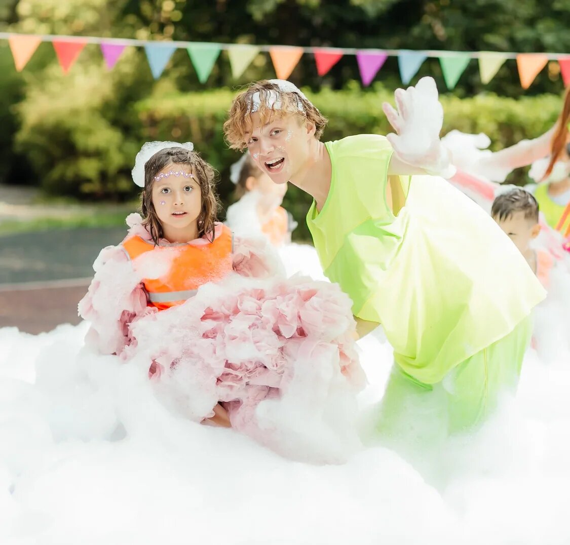 Зачем? Когда? Для чего? Пенная вечеринка — это удовольствие для летних именинников. Иногда удаётся захватить позднюю весну или раннюю осень. Но важно пристально следить за прогнозом погоды. Для пенной вечеринки нам потребуется много солнца, очень много солнца! Тогда все точно получится. Если прогноз рисует дождик, лучше перенести party на другой день. Мы же не хотим, чтобы дети замёрзли и простудились, правда? Кроме солнечной погоды, для пенной вечеринки нам потребуется открытая площадка, толпа гостей, оборудование и специальная жидкость-концентрат. Но обо всем по порядку. Для пенной вечеринки важно выбрать ровную открытую площадку с газоном или песком. На траву, грунт или песок можно безболезненно падать — ничего страшного с гостями не случится даже во вр