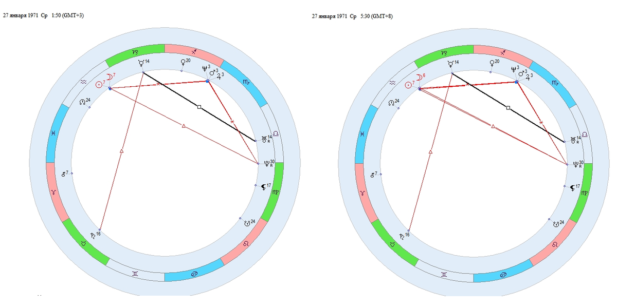 27.01.1971г. Видите в них различия? Видите? Верно! Их нет! Почему, спросите Вы? А потому (отвечу я Вам, раз уж у Вас возник этот вопрос), что дата рождения человека отражает только расположение планет в знаках Зодиака на момент, собственно, его рождения. С помощью космограммы (даты рождения) астролог может увидеть и составить психологический портрет человека, без каких-либо обстоятельств его жизни, т.е. вне общества.