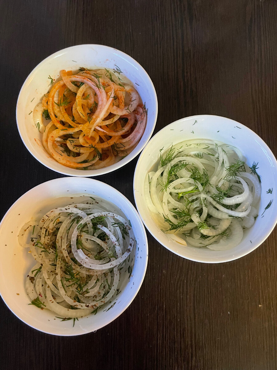Лук-самая лучшая закуска к мясу. А маринованный лук в сто раз вкуснее. Для маринадов нам понадобится: Первым делом нарезаем лук тонкими кольцами и делим их на три равные части. После добавления всех ингредиентов, все тщательно перемешиваем и оставляем в холодильнике на два часа. Эта закуска никого не оставит равнодушным и закончится быстрее основного блюда. Приятного аппетита и до новых рецептов!