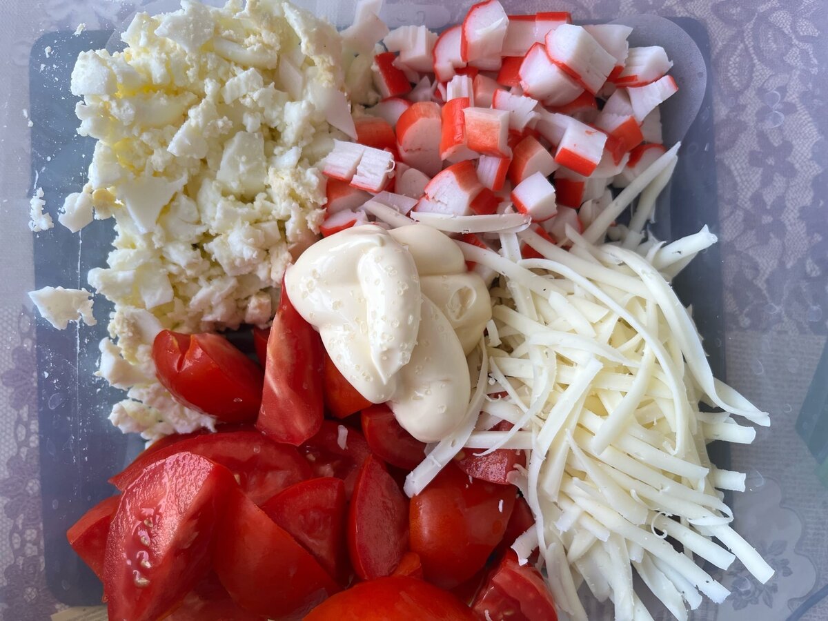 Ингредиенты: - Яйца - Помидоры - Безлактозный сыр - Безлактозные крабовые палочки - Чеснок - Майонез - Соль Думаю описывать процесс как я сварил яйца и все порезал/потер никому не нужно. Перейду сразу к делу. Безлактозный сыр я покупаю в обычных магазинах: магнит, пятерочка, дикси, бывает почти везде, но не всегда в наличии Крабовые палочки я беру "русское море" самые обычные. В составе нет пшеницы, ее заменили на картофельный и кукурузный крахмал. Но следы глютена возможны. То есть для тех, у кого просто непереносимость подходит, а для аллергиков нет. Берите самые обычные, так как в остальных видах крабовых палочек состав другой! Такие крабовые палочки продаются вообще везде, проблем с их покупкой у меня никогда не возникало. Ну а в майонез никогда не кладут ни глютена, ни лактозу, но на всякий случай прочитайте состав перед покупкой. Приятного аппетита!