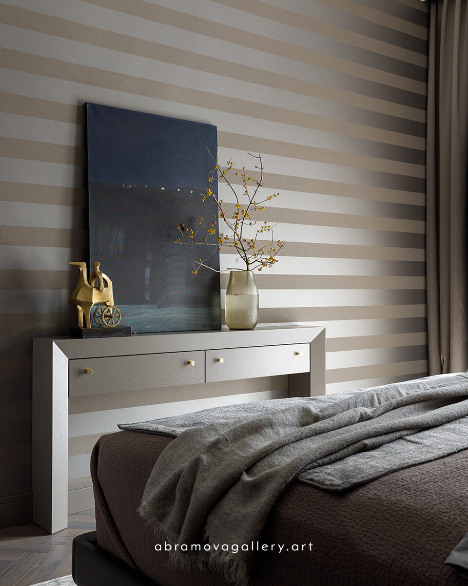 Выбирая предметы искусства для интерьера, можно не останавливаться на одном произведении, а создать интересную многозначную композицию. Например, работа «Лагуна» Александра Румянцева и скульптура «Бог Солнца» Фёдора Крушельницкого могут составить органичный союз, который не только подчеркнёт вкус владельца, но и раскроет эти работы в новом ракурсе. Тяжелая литая бронзовая фигура солнечного Бога, поднимающаяся по небосклону, изображенная Крушельницким в своей характерной манере, отсылает к примитивному искусству и индустриальным формам, подчерпнутым скульптором в эстетике русского авангарда. Представленная вместе с минималистичным полотном Александра Румянцева, скульптура вступает с ним в колористическое взаимодействие — золото перекликается с бликами живописной «Лагуны». Стоящий на фоне ночного пейзажа «Бог Солнца» будто только что спустился с небосклона, ослабив поводья колесницы, и отправился на отдых. Лишь золотые пятна на горизонте ночного моря напоминают о его вечном долге, благо