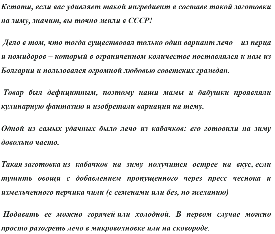 Заготовка кабачков на зиму была актуальна всегда. Если судить по советским кулинарным книгам, то в нашей стране народ повально увлекался консервированием. Заготовки из кабачков на зиму – это, в первую очередь, кабачковая икра. Но есть еще лечо, овощные салаты, варенье, джемы, маринованные кабачки и даже вариации на тему аджики. Приготовьте лечо из кабачков на зиму Технология приготовления: Еще один проверенный рецепт. Кабачки, маринованные со сладким перцем Технология приготовления: Хрустящие маринованные кабачки Технология приготовления: Маринованные кабачки с красной смородиной и перцы с крыжовником Технология приготовления: Аджика из кабачков в дачном стиле Технология приготовления: Кабачки гриль в пикантном маринаде Ну и на последок сладенькое. Варенье из кабачков Джем из кабачков с апельсином и имбирем Технология приготовления: Все рецепты проверены десятилетиями и очень вкусные. Выбирать вам. Готовьте с удовольствием и не забудьте подписаться на мой канал!