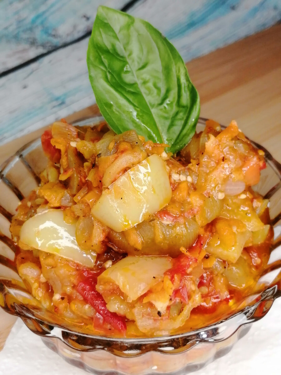 ▪️Во французский кухне словом сотэ называют способ приготовления блюда, при котором продукты быстро обжариваются на сильном огне в небольшом количестве растительного масла. Причём их не перемешивают, а встряхивают, чтобы не помять и сохранить их сочность. ▪️Сотэ (соте) готовят из курицы, рыбы и конечно из овощей. ▪️То, что мы готовим в домашних условиях, скорее рагу, но без добавления воды. Но разве в названии дело?! Главное, чтобы вкусно было! 😉😊 Я расскажу свой способ приготовления сотэ - рагу. Количество продуктов по желанию и наличию. У меня было: 🔸Баклажаны 5шт 🔸Морковь 1шт большая 🔸Лук репчатый 3-4шт 🔸Перец болгарский 3-4шт 🔸Помидоры крупные 4-5 шт 🔸Чеснок 1-2 зубчика 🔸Соль, специи (у меня чёрный перец и острый красный) по вкусу. Сахар тоже добавить около 1,5 ч.л. 🔸Зелень (у меня прованские травы) - Баклажаны почистить от кожицы, нарезать не очень мелкими кусочками и слегка присолить. Оставить минут на 15. - Лук мелко порезать, морковь на терке (или соломкой). - Помид
