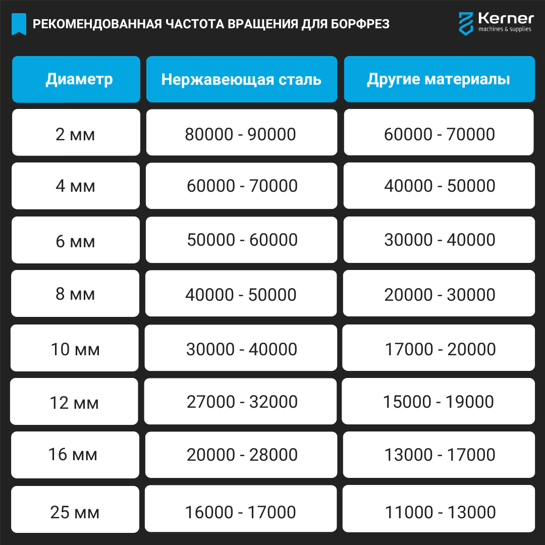 Выбирайте правильную скорость Из-за небольшого размера борфрез на них не размещают данные об оптимальных скоростях вращения, поэтому мы подготовили таблицу с информацией: Работа на скорости, превышающей максимально рекомендованную, приведет к ускоренному износу режущего инструмента и его поломке. Если будете работать на слишком низких оборотах – упадет производительность. Не оказывайте слишком большого давления на инструмент Слишком сильное давление на борфрезу сокращает ее ресурс. Зубья будут отламываться или быстро затупляться. Удерживайте в движении Старайтесь не держать работающую борфрезу неподвижно, чтобы не допустить дефектов обработки из-за врезания в металл. Чтобы поверхность оставалась ровной, заканчивайте работу движением вверх. Используйте только качественные борфрезы Качественная борфреза, несомненно, облегчит работу с металлом. При этом прослужит долго, не теряя характеристик. Мы рекомендуем борфрезы Bohre [Борэ] – отличный инструмент за приемлемые деньги