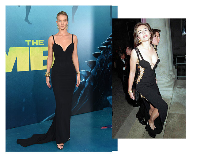 Иногда звезды не знают, чем удивить зрителей. И пока одни надевают «голые» платья, другие обращаются к прошлому, в особенности архивным коллекциям. Иногда знаменитости просто выходят в старом наряде, а другие создают более сложные образы, которые только отсылают к предыдущим творениям. Ну а фанаты даже не против расшифровывать такие модные загадки! Кто из звезд вдохновился или скопировал предыдущие платья? Роузи Хантингтон-Уайтли Не так давно Роузи Хантингтон-Уайтли посетила премьеру фильма «Мэг: Монстр глубины», в которой одну из главных ролей исполнил ее избранник Джейсон Стейтем. Для совместного выхода с возлюбленным на красную дорожку супермодель выбрала корсетное черное платье Stella McCartney с волнующим декольте и длинным шлейфом, которое дополнила классическими черными босоножками Jimmy Choo, массивными золотыми серьгами и браслетами от Sidney Garber. В Instagram (Социальная сеть признана экстремистской и запрещена на территории Российской Федерации) Stories бывший «ангел» Vict