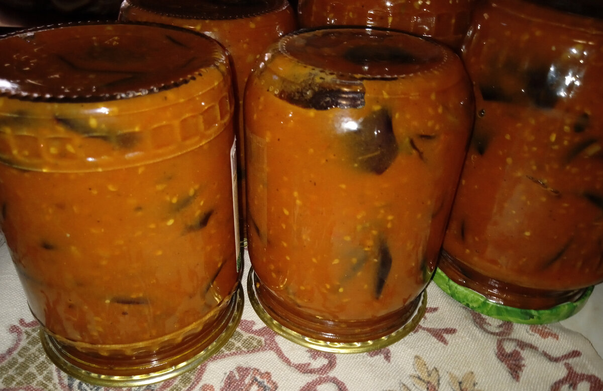 Баклажаны нарезать кольцами, толщиной 1 см., посолить и оставить на ночь. Помидоры помыть, почистить, измельчить на мясорубке или любым удобным способом. Томат закипятить и проварить полчаса час, в зависимости от густоты томата. Оставить до утра. Утром отжать баклажаны. Почистить и измельчить чеснок и зелень. Пережарить баклажаны в растительном масле по две минуты с каждой стороны. В кипящее масло высыпать зелень с чесноком и влить чайную ложку уксусной эссенции, разбавленной водой. Снять с огня. Томат закипятить, добавить соль и сахар по вкусу, соблюдая пропорцию две части сахара на одну часть соли. Добавить специи. Помыть и закипятить крышки и банки. В томат высыпать жареные баклажаны, дать прокипеть пять минут. Вылить туда же масло с чесноком и зеленью. Прокипятить ещё пять минут и можно разливать по стерилизованным банкам. У меня было примерно по три килограмма баклажанов и томатов. На это количество томата сахар 6 столовых ложки без горки, соль 3 столовых ложки без горки