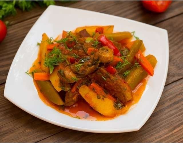 Ингредиенты(на одну порцию): -Говядина(или любое мясо)(125г) -Репчатый Лук(1,5 головки) -Соленые огурцы(1 штука) -Томатная паста(1 чайная ложка) -Картофель(0,2кг) -Мясной бульон(2,5 столовой ложки) -Чеснок(1 зубчик) 1. Мясо промыть, нарезать соломкой и слегка обжарить в казане в разогретом растительном масле. 2. Добавить порезанный тонкими полукольцами лук и обжаривать мясо с луком до мягкости лука. 3. Добавить томатную пасту, мелко нарезанные или тертые на крупной терке огурцы. Залить водой или бульоном и тушить под крышкой до полной готовности мяса. 4. В отдельной сковороде обжарить нарезанный соломкой картофель. 5. Когда картофель будет почти готов, переложить его в казан с тушеным мясом, добавить, соль, перец, лавровый лист и пропущенный через чеснокодавилку или мелко порезанный чеснок. 6. Осторожно перемешать и тушить картофель с мясом до готовности примерно 5-7 минут. Азу по-татарски. Одно из немногих блюд, удостоившихся в советской продуктовой традиции продажи с именной нарезко