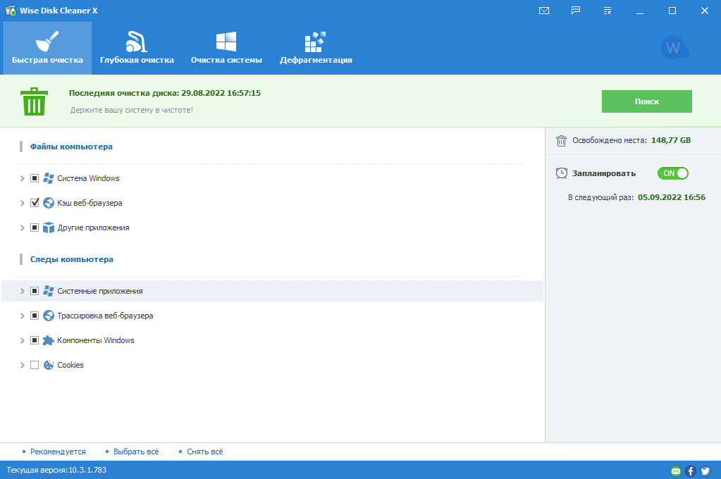 Всем привет! Сегодня я хотел бы рассказать о такой программе, как wise disk cleaner. Призвана она очистить ваш Пк от мусора и временных файлов. Интерфейс программы выглядит так: На вкладке "Быстрая очистка" мы видим те файлы, которые может очистить программа. Сюда относится кэш системы, браузеров, и прочий программный мусор.