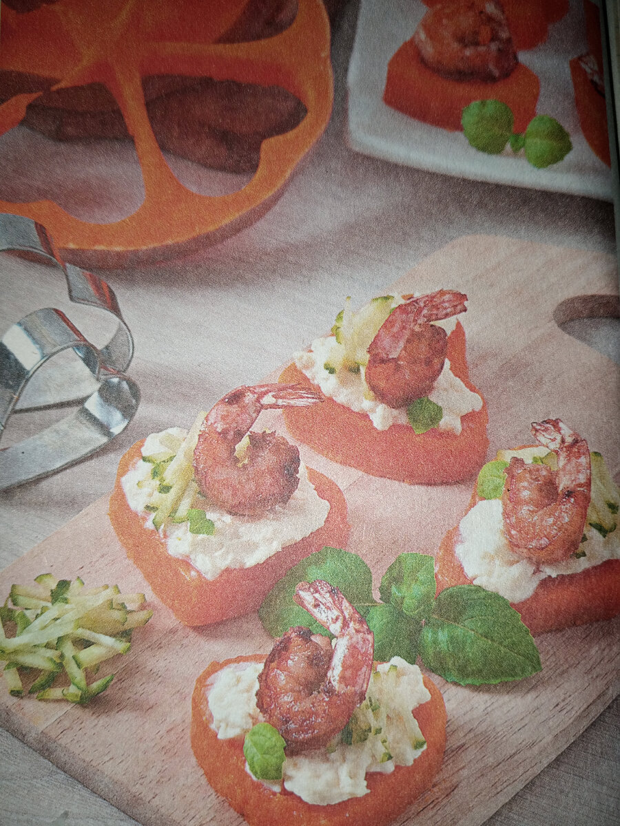 - .На сердечко из тыквы положить сырную смесь, немного огурчиков и креветку. Украсить зеленью.