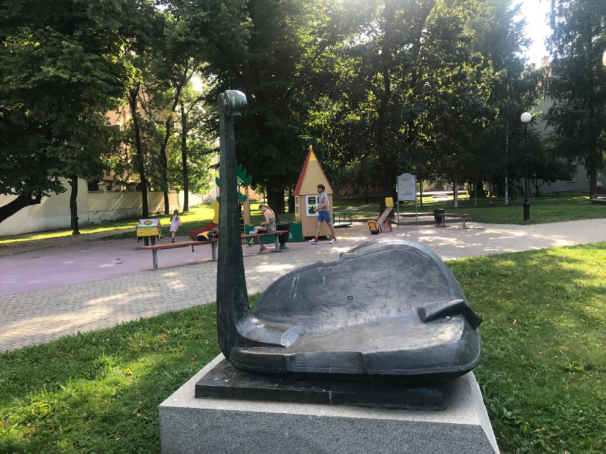 Вообще-то, сквер. Но не важно. Андрей Петров так много сделал для нас в музыкальном плане, его музыка так дополнила кинокартины, что мы уже не знаем, что было раньше «Осенний марафон» или музыка из этого фильма… и так во всем: практически все фильмы Эльдара Рязанова связаны с музыкой Андрея Павловича. Он работал и с другими режиссерами, писал музыку в разных жанрах. Есть и оркестровые произведения, музыка для музыкального театра, есть камерные произведения и музыка для вокального исполнения. Но больше всего - для кино, конечно. Вот так и этот небольшой сад его имени: весь наполнен музыкой. Но музыкой в камне. Застывшей музыкой. В чем-то схожей, а в чем-то разной. Есть музыка-лебедь, музыка-кресло, музыка-граммофон. Мне кажется, идея скульптур в том, что музыка нас сопровождает везде, может заучать из машины, радио, на улице, и из наушников в конце концов, она может застигнуть нас в любой момент жизни и слиться с имеющимся перед глазами впечатлением. Вот эту сиюминутность музыки и