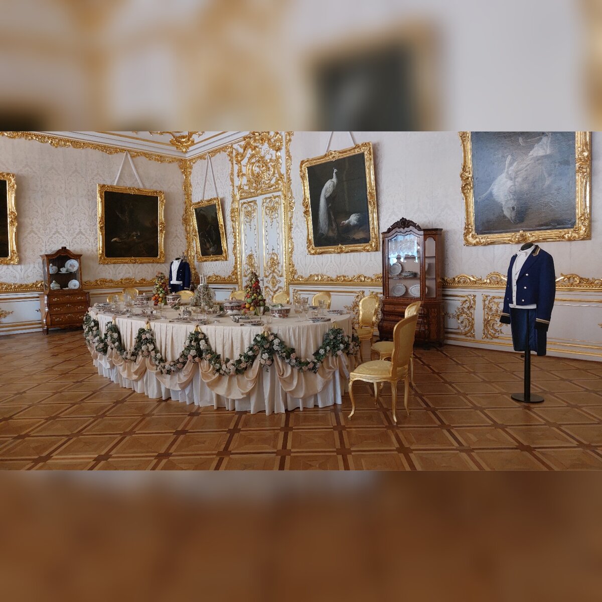 Продолжаем наше путешествие по дворцу: - Белая Парадная столовая: Белая Парадная предназначалась для торжественных обедов и «вечерних кушаний» императрицы в узком кругу приближенных. В центре зала размещен овальный стол с сервизом, изготовленным на Мейсенской фарфоровой мануфактуре. Этот сервиз украшал парадные столы во время торжественных обедов императрицы, а стол накрывали скатертями со сложными драпировками, украшенным цветочными гирляндами. - Малиновая и Зеленая столбовая: Малиновая и Зеленая столбовые - два небольших зала, расположенных один за другим. Залы украшены прозрачными стеклянными пилястрами - «столбами», с подложенной под стекло малиновой и зеленой фольгой, которые и дали названия комнатам. Здесь хранился фарфор и столовое серебро. - Портретный зал: В Портретном зале Екатерининского дворца издавна демонстрировались парадные изображения царственных особ. Ныне на стенах, затянутых белым узорчатым штофом в обрамлении золоченой резьбы, помещены парадные портреты Екатерин