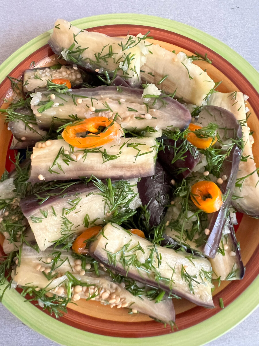 6.Затем перекладываем баклажаны в другую посуду,добавляем укроп,чеснок,растительное масло и горький перец(по желанию),все аккуратно перемешиваем и оставляем на 3-4 часа мариноваться,затем можно кушать.