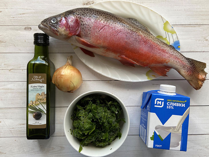 Средиземноморская Прекрасное блюдо, которое определенно разнообразит рацион любой семьи. Форель сама по себе очень вкусная рыба, но если дополнить ее соусом из сливок и шпината, то получается по-настоящему праздничное блюдо. Его можно подать с картофелем, рисом или овощами — или вообще без гарнира. Соус из шпината делает рыбу ароматной и совершенно преображает привычный вкус в лучшую сторону. Ингредиенты: Как приготовить: 1. Прежде всего нужно разделать рыбу. Если у вас, как и в нашем случае, взята тушка, то очистите ее от чешуи и внутренностей, а затем нарежьте. Для приготовления этого блюда можно использовать как стейки, так и филе форели. 2. Репчатую луковицу очистить от шелухи и нарезать максимально мелко кубиками. 3. Обжарьте лук. Обжаривать лук лучше всего на оливковом масле — так ваше блюдо будет более похоже на средиземноморскую кухню. Подсолнечное может перебить нежный аромат шпината, тушенного в сливках. 4. Когда лук станет мягким, в сковороду добавьте измельчённый шпинат. В