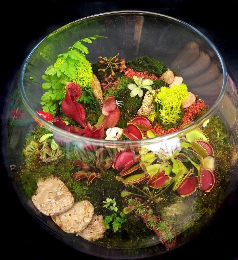 Как выше и писала-просторный,продуманный до мелочей и обеспеченный идеальными условиями(освещение,полив,температура,влажность,правильная наслоенность посадочного материала).в одном аквариуме могут содержаться растения только одного содержания.пример я писала выше-росянки и пузырчатки(если мы рассматриваем разные виды хищников).либо это несколько сортов одного вида.напрмер несколько сортов не зимующих росянок с одинаковым поливом (капская,алисия,спатулата и пр.),либо это несколько видов саррацений,их прекрасно можно отравить на зимовку всех вместе.возможно так же посадить мухоловку при желании,но это если у вас есть реальный опыт и вы знаете как исправить ситуацию в случае каких то проблем.