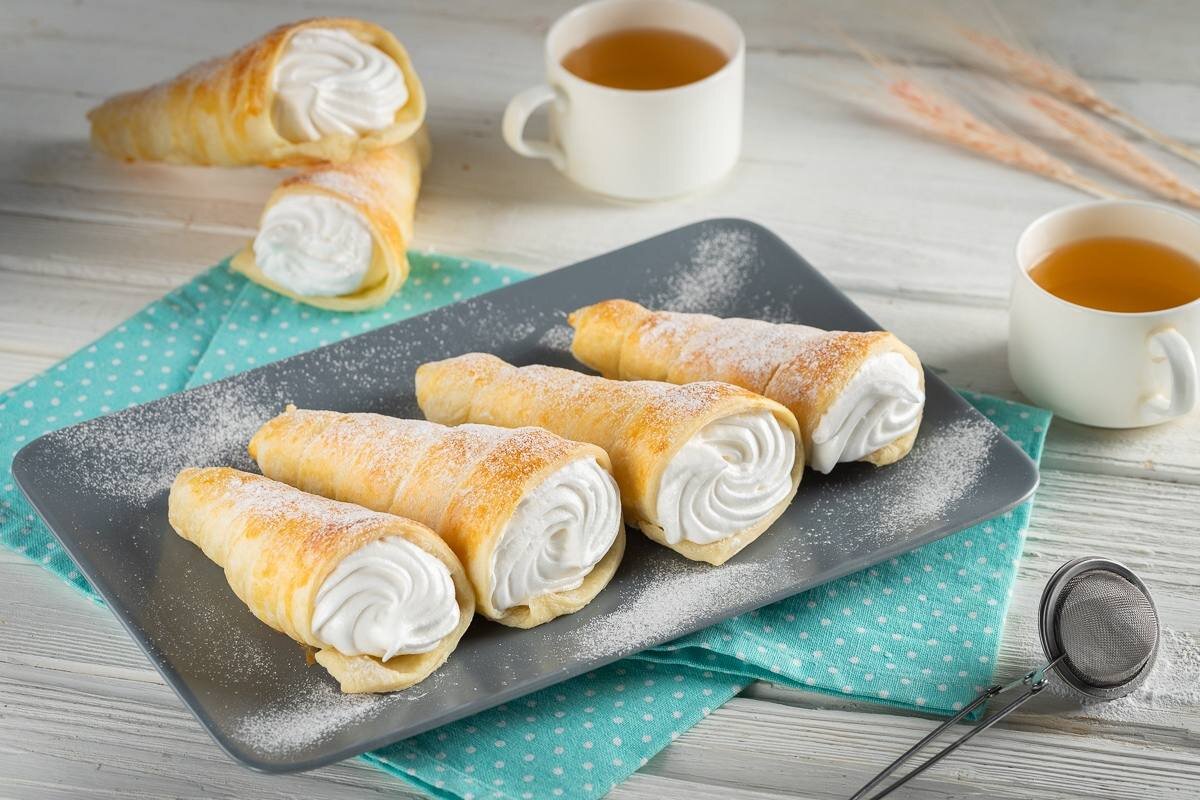 📖 Ингредиенты: - Слоёное тесто - 500 г. - Яичный белок - 3 шт. - Лимонная кислота - щепотка - Соль - щепотка - Сахар - 200 г. - Воды - 60 мл. - Желток - для смазывания 🧑🏻🍳Приготовление: 1. Вырезать из фольги квадраты и свернуть конусом. 2. Стол присыпать мукой и раскатать готовое тесто в прямоугольный пласт толщиной 0,5 сантиметров. 3. Разрезать на полоски шириной примерно по 2-2,5 сантиметра. 4. Готовые полоски накрутить на ранее подготовленные конусы из фольги, смазать желтком. Отправить в разогретую до 180С духовку на 15-20 минут. 5. В сотейник всыпать сахар, налить воду и поставить на огонь. Варить до готовности. 6. В чаше взбить белки с солью и лимонной кислотой до получения устойчивой пены. 7. Продолжая взбивать белки добавить сироп. Взбивать еще 5 минут. Готовый крем переложить в кондитерский мешок. 8. Остывшие трубочки заполнить кремом. #трубочки #трубочкисбелковымкремом #десерт 🔝