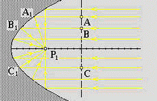 С.Б. Каравашкин, О.Н. Каравашкина e-mail: sbkaravashkin@gmail.com Труды СЕЛФ блог «Classical Science» Оригинал Как известно, основными оптическими свойствами параболического зеркала являются: 1) фокусирующее свойство, т.е. все лучи параллельного пучка света, падающие на него, фокусируются в одной точке, как и все лучи света, испущенные из фокуса такого зеркала образуют параллельный пучок света, как показано на рис. 1. Рис. 1. Схема распространения лучей света при отражении от параболического зеркала 2) Длины всех лучей в результате отражения от параболического зеркала равны между собой т.е. AA1P1 = BB1P1 = CC1P1 ; таким образом, параболическое зеркало теоретически формирует плоскую волну. С учётом методики истинного и мнимого луча [1], представленной в предыдущей теме, рассмотрим отражение света от движущегося параболического зеркала, когда источник находится в его геометрическом фокусе с точки зрения сопутствующей системы отсчёта. При этом мы должны в модели учесть ранее выявленные ос