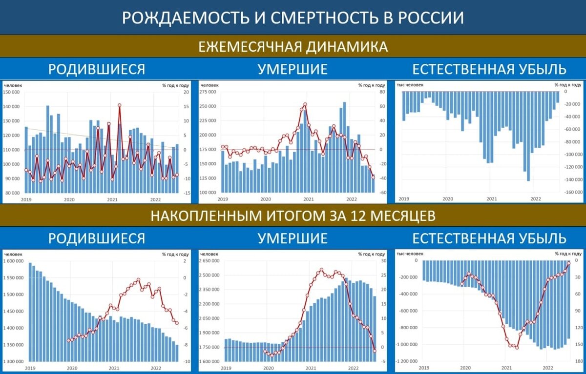 Итоги июля (https://rosstat.gov.ru): • Родившихся: 113.9 тыс (-8.6% гг) • Умерших: 131.8 тыс (-38.8% гг) • Естественная убыль: -17.8 тыс VS -28.7 в июне и -90.7 в июле прошлого года Итоги января-июля: • Родившихся: 749.8 тыс (-6.6% гг) • Умерших: 1150 тыс (-12.5% гг) • Естественная убыль: -401 тыс vs -512.5 тыс в 2021г Смертность в июле была даже ниже, чем в доковидном 2019г. Но это, по-видимому, локальный минимум. Уже в августе смертность от ковида пошла вверх, так что и показатели общей смертности пойдут вверх. Что касается рождаемости, то тут без изменений – снижение идёт очень быстрыми темпами, и перелома этого тренда не видно. Естественная убыль в этом году будет меньше прошлогоднего миллиона, но сокращение населения на 600-650 тыс получим наверняка
