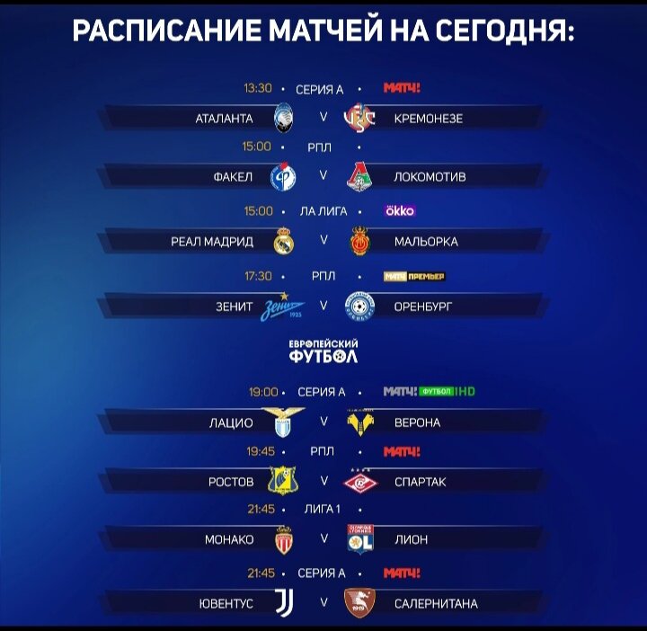 Вот такое расписание матчей футбола на сегодня.