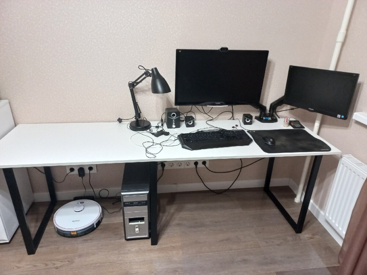 Высота - 69 см (специально делал немного заниженный от стандартной высоты). А вот такой стол был раньше: Было свободное время, деньги и надо было организовать второе рабочее место, а место в однокомнатной квартире не очень много. Поэтому созрела мысль сделать двойной стол. Потратил на стол: Панель ЛДСП купил в Леруа - 1 986 руб