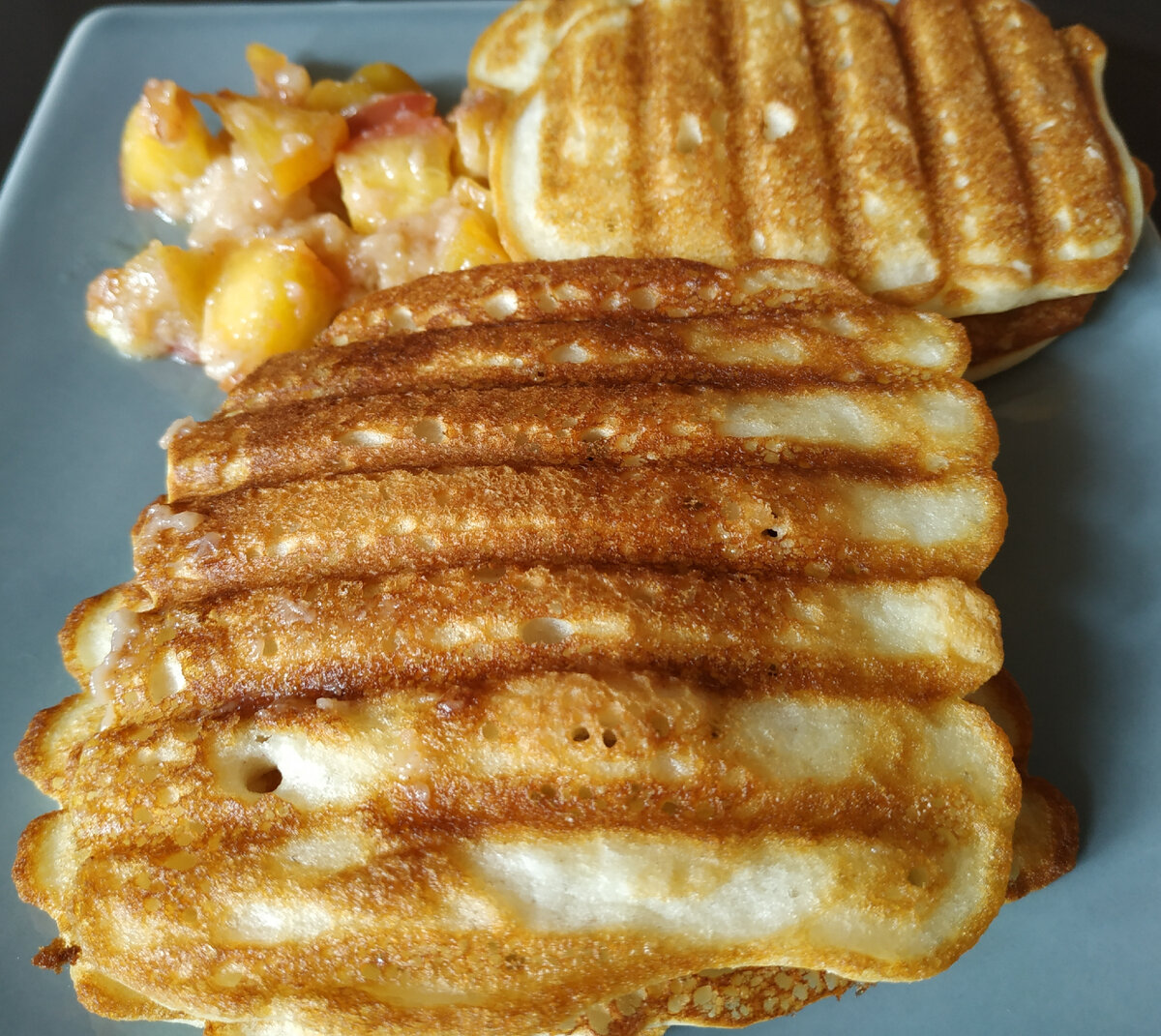 Ингредиенты для вафель: Творог мягкий 5% - 100 г; Молоко - 25 г; Яйцо куриное - 1 шт; Сахар (можно и без него) - 3 г; Мука рисовая - 50 г; Разрыхлитель для теста - 3 г Приготовление: Яйца слегка взбить вилочкой с сахаром, добавить мягкий творог, молоко, перемешать. Затем добавить муку и разрыхлитель. Тесто получается, как густая сметана. Жарить в вафельнице. У меня таковой нет, я жарила на гриль-сковороде, поэтому у меня полоски только в одну сторону. 🤭 Вафли получаются очень воздушными и мягкими. Можно кушать со сметаной, медом, сгущенкой, вареньем. Можно и без всего - это на любителя. Мне сегодня захотелось их с карамелизированными фруктами. Сделать их просто - нарезать несколько видов фруктов на кусочки, потушить их немного в сливочном масле, добавить коричневый сахар и чуть-чуть корицы. Попробуйте, это вкусно! 😋 ❤️ Приятного аппетита! ❤️
