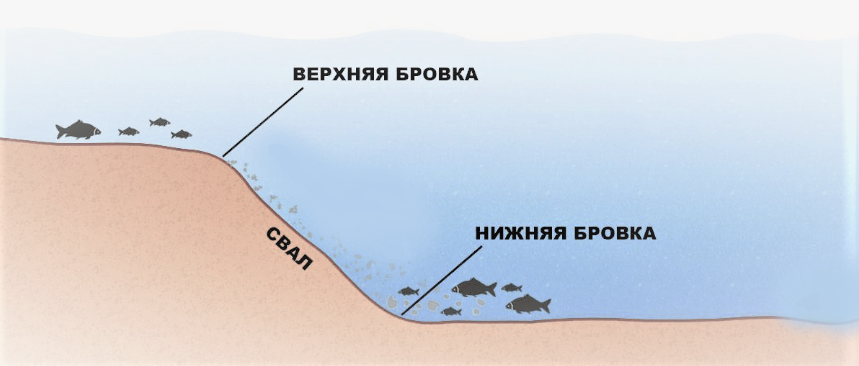 Приветствую, рыбаки! Стоит посмотреть любого, рыболовного Ютуб блогера, который рыбачит на фидер или "карпятник", то в начале видео, когда промеряют дно, ищут все время бровку. Конечно, бровку не всегда можно найти, но все хотят найти именно ее, а если уже нет, то ищут другие аномалии на дне. Что же такое "бровка", чем хороша и как найти - разберемся в статье. Бровка в рыбалке - это линия резкого перелома склона, отделяющая верхнюю пологую его часть от нижележащего крутого участка склона. Бровки делятся на нижнюю и верхнюю, часто рыбаки любую из них просто называют "бровка". Самое простое, объяснение бровка на картинке снизу: Чем же хороша бровка в рыбалке Она выполняет для рыбы несколько полезных функций для рыбы: Например, вам не будет уютно, посредине оживленной трассы, где вас могут сбить, так и рыбам, на открытом участке водоеме попросту опасно находиться, вот и ищут укрытия. Корм, сносимый течением, всегда будет задерживаться на аномалиях, ямах и конечно, бровках. А, если течени